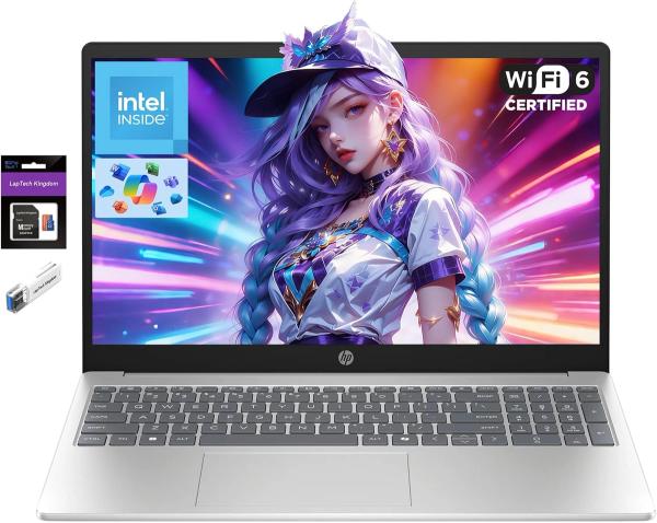 Meet the HP 15.6" Laptop, your reliable partner for productivity, creativity, and entertainment. Designed for students and busy professionals, this laptop combines essential performance with thoughtful features to keep you connected and efficient all day. At its core, the Intel N100 quad-core processor and substantial 16GB of DDR4 RAM ensure smooth multitasking. Effortlessly handle online classes, research, document editing, and light creative projects without slowdowns. The 256GB of internal storage, plus the included 128GB SD card and reader, provides ample, convenient space for all your assignments, media, and files. Experience vibrant visuals on the 15.6-inch BrightView display with an anti-glare panel, designed for comfortable viewing whether you're streaming content or working outdoors. Stay securely connected with the latest Wi-Fi 6 and Bluetooth 5.4 technology. A privacy camera, all-day battery life with fast charging, and a one-year Microsoft 365 subscription with Copilot AI support make this a complete package for modern computing. This HP laptop is ready to help you learn, create, and achieve from anywhere.